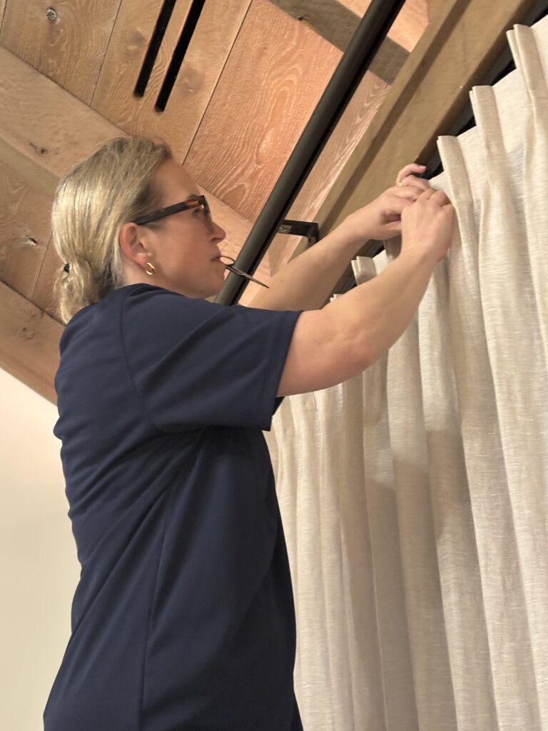 Lenny, Jordan, Dan, and I spent days on site walking rooms, checking alignments, adjusting details, steaming endlessly, and making sure every panel, pleat, and treatment was intentional. This wasn’t oversight from afar or a check-in call at the end of the day. This was boots-on-the-ground execution, because when you’re installing dozens of panels across multiple buildings, millimeters matter.